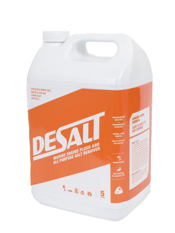 The 5 litre DeSalt concentrate makes up to 100 litres at 5% dilution. Use DeSalt on boats, jet skis, kayaks, fishing and dive gear - use it on any equipment that comes in contact with sea salt. Designed to dissolve the salt from all surfaces as well as clean and protect your property from the corrosive nature of the sea and the salt air.